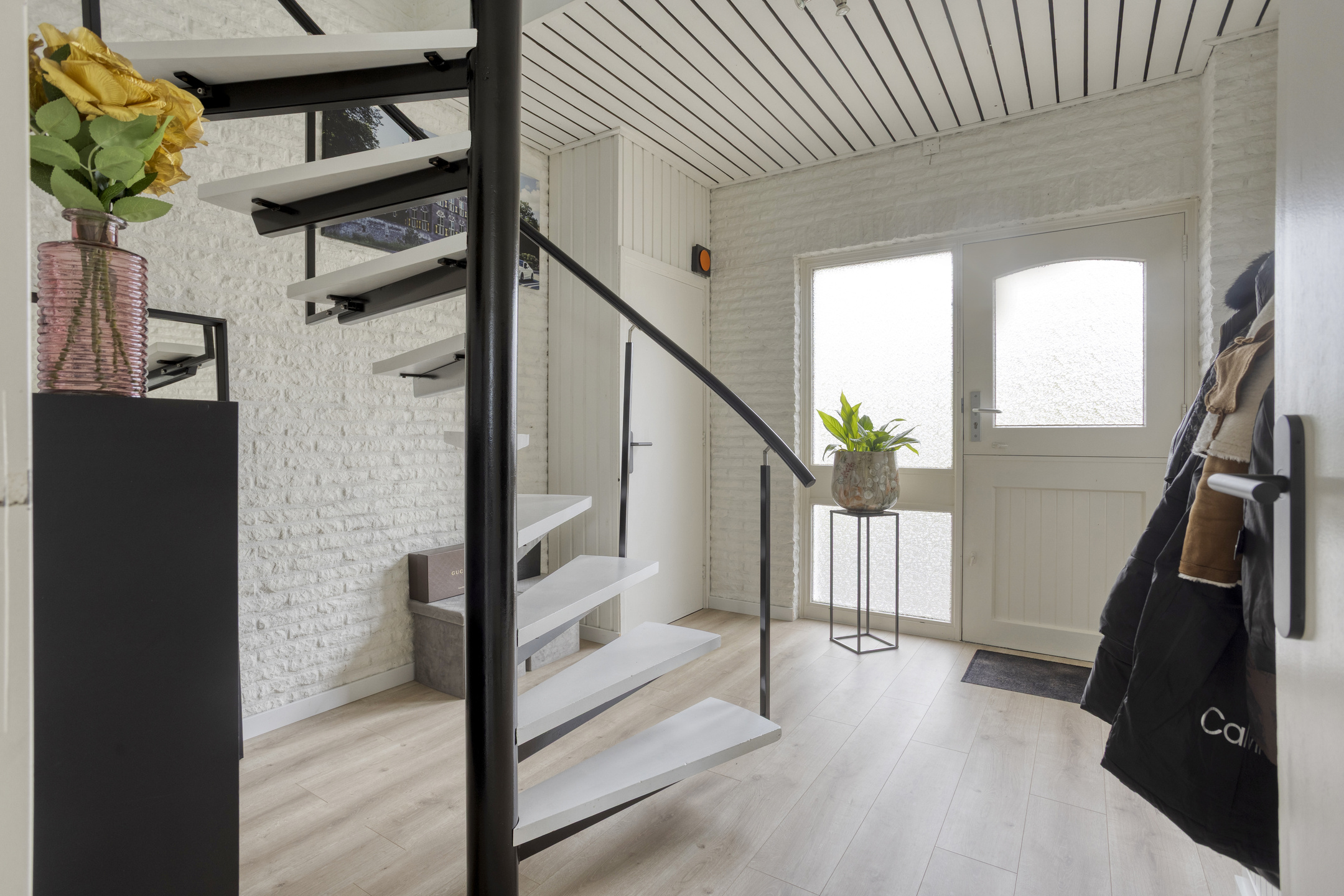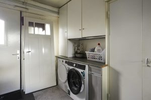 Aansluitend bereik je de tweede hal met de moderne toiletruimte en toegang tot de praktische garage/bijkeuken. Hier bevinden zich de witgoedaansluitingen en is volop ruimte voor opslag, hobby of klusruimte.