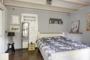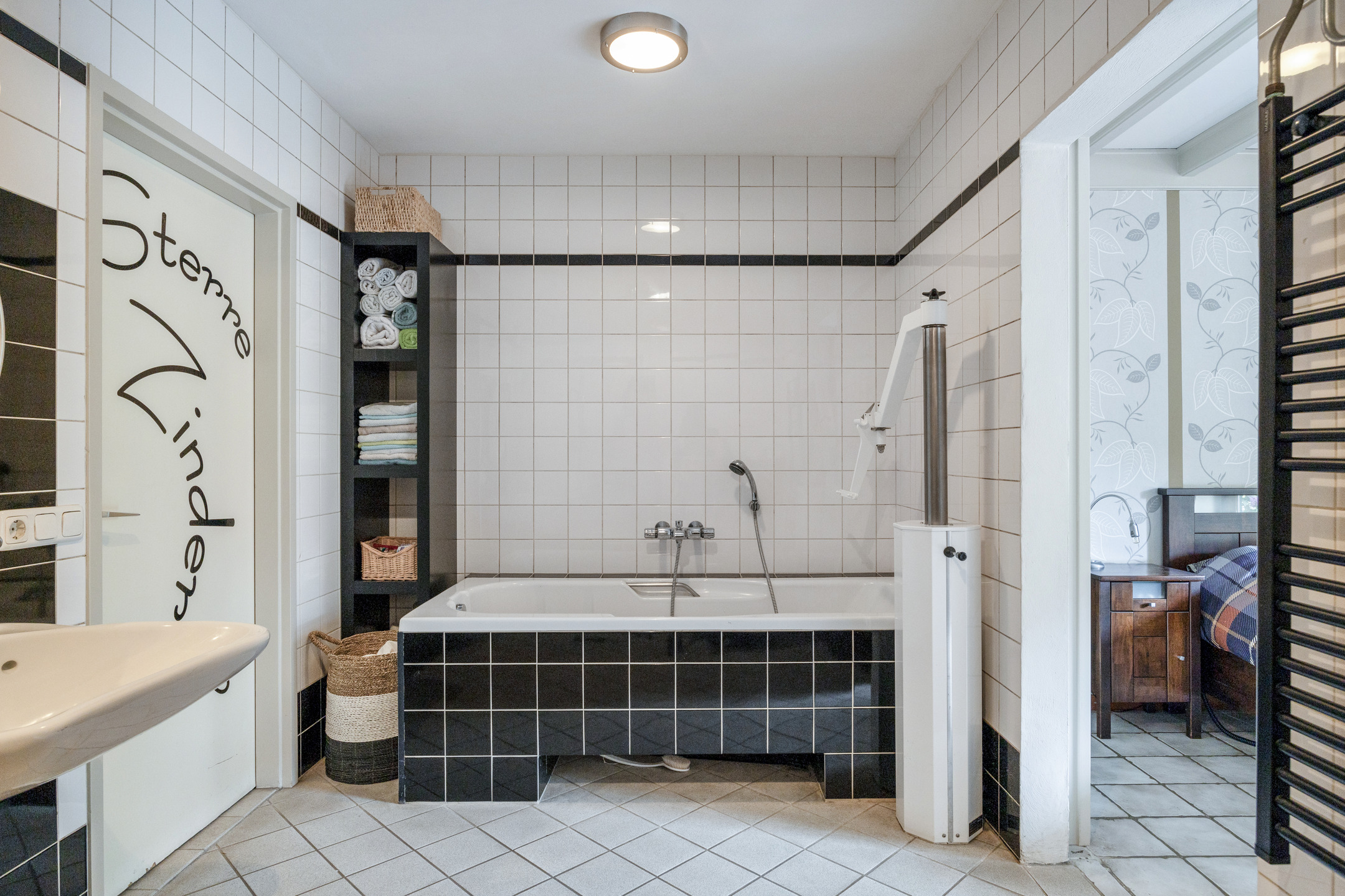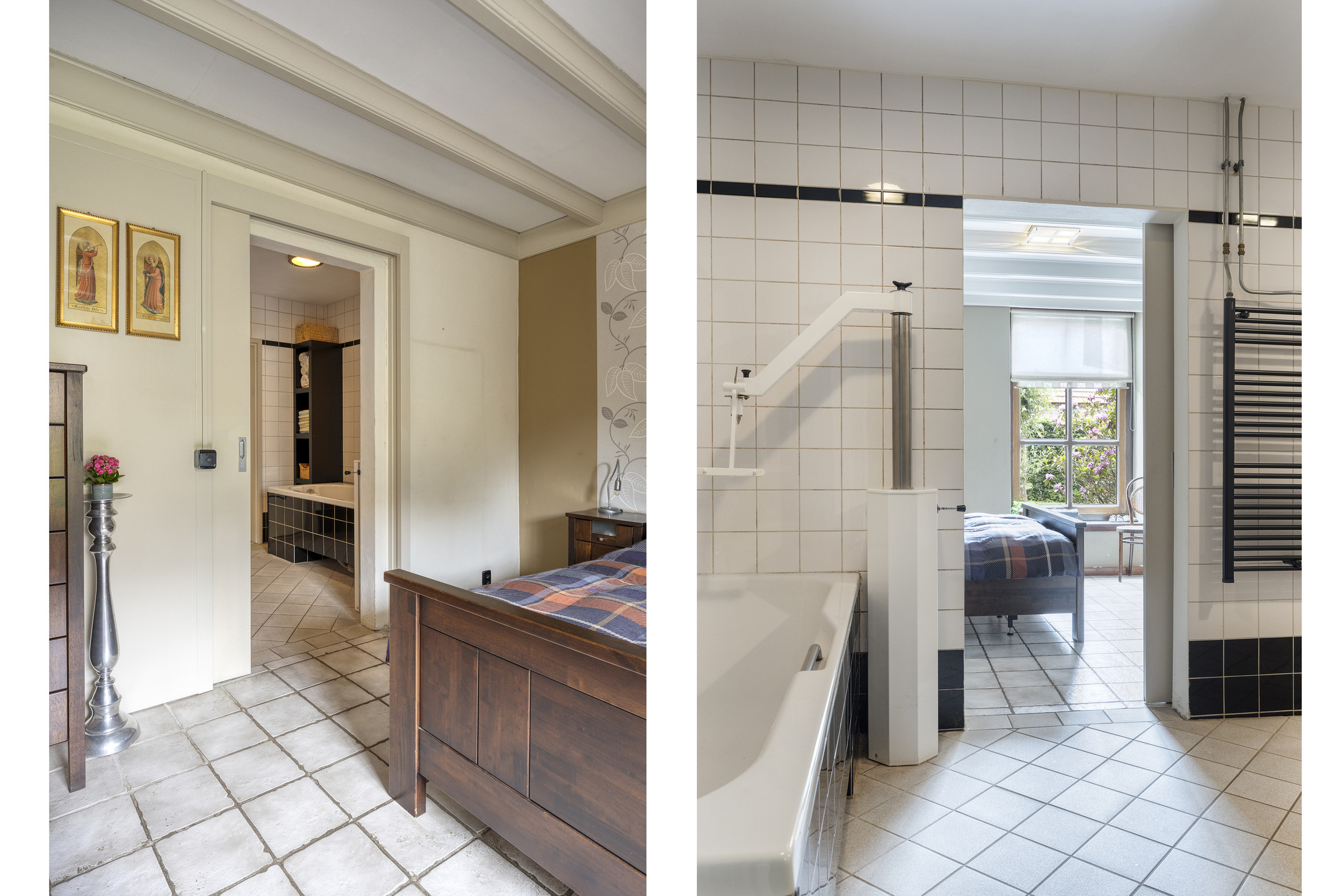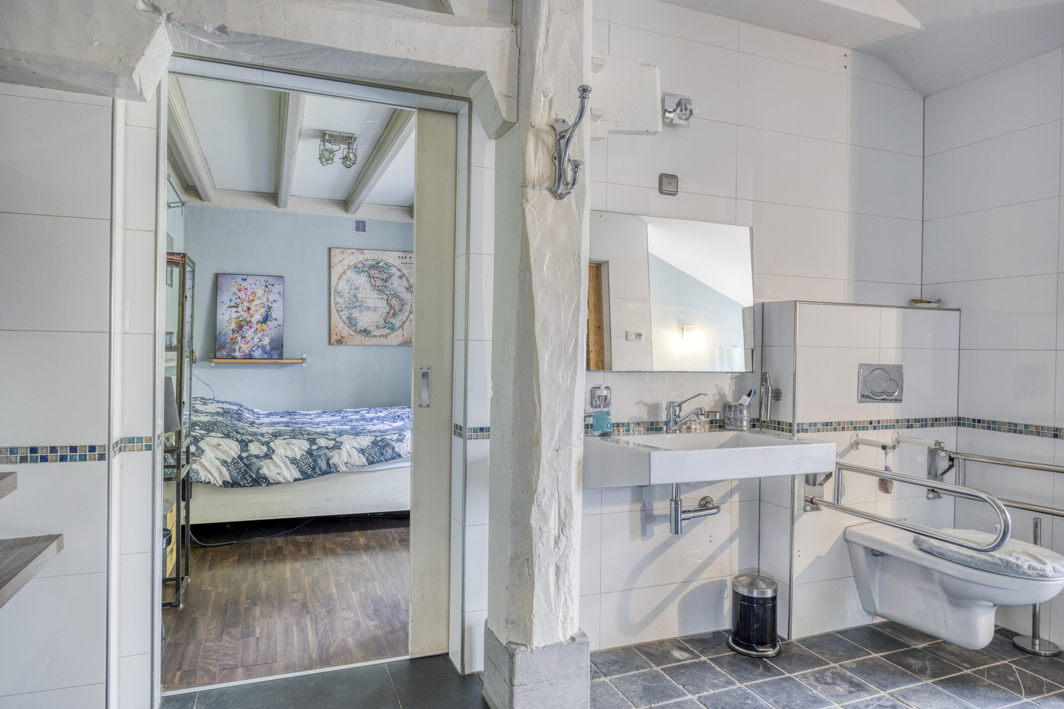 Ook hier vind je een eigen badkamer ensuite met ligbad, douche, toilet en wastafel, een tweede separate douche en een eigen trapopgang naar de bovenverdieping. De combinatie met het achterhuis maakt deze woning ideaal voor dubbele bewoning, een B&B of mantelzorg.