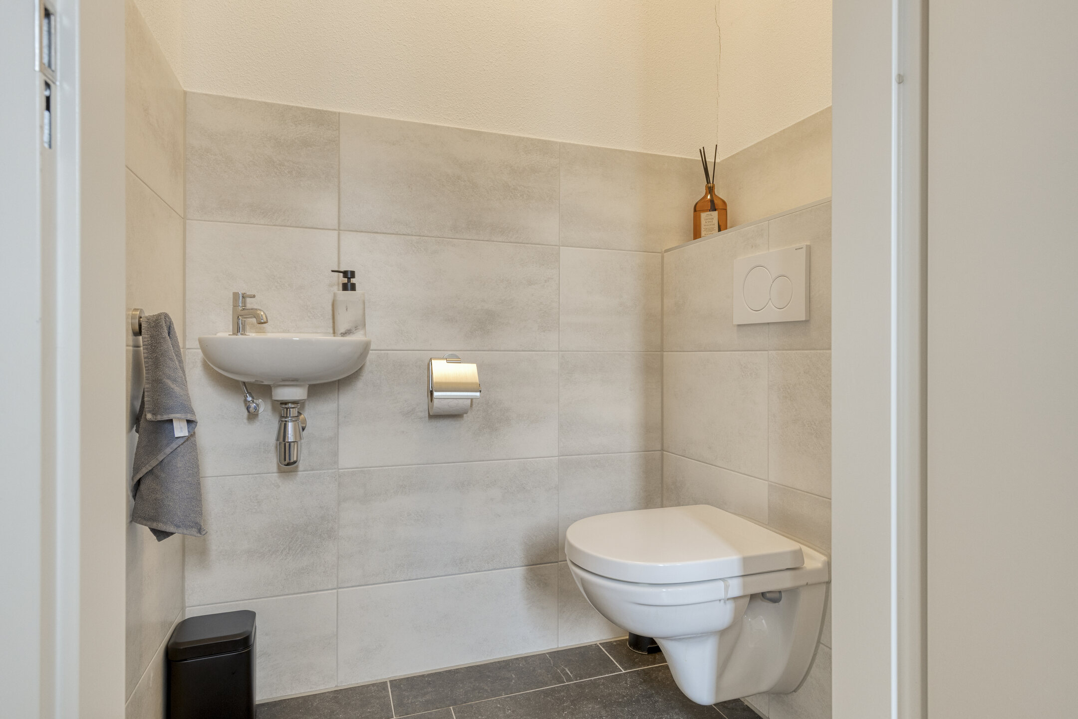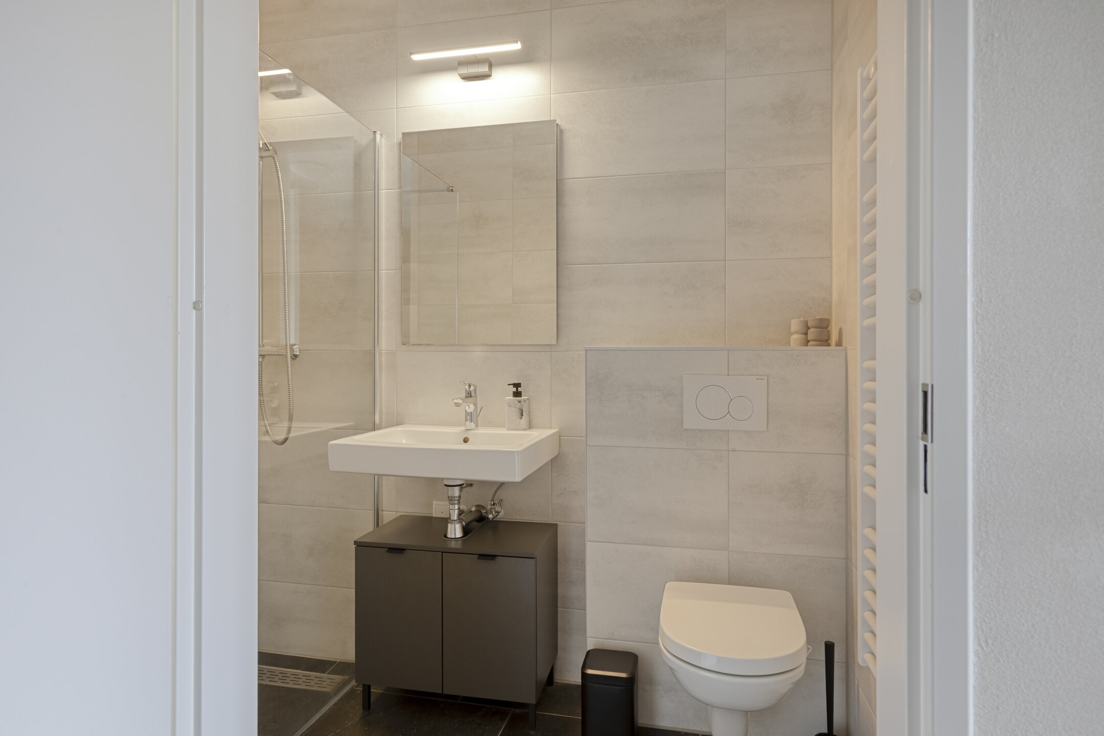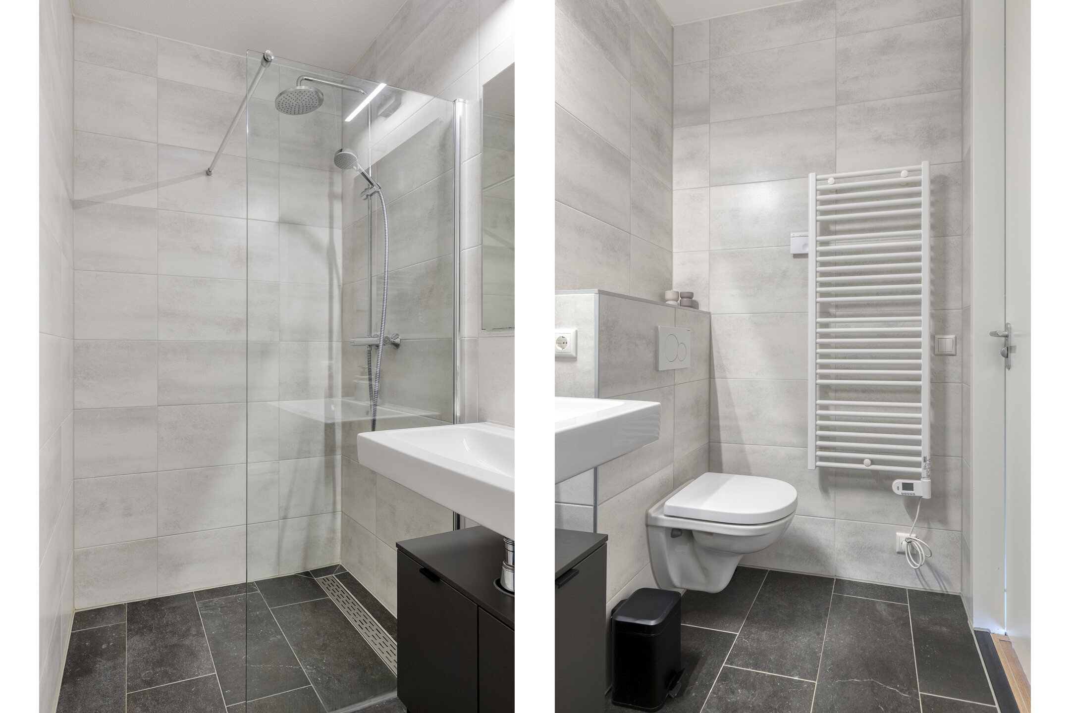 – Moderne, luxe badkamer uitgerust met inloopdouche, wastafelmeubel, toilet en designradiator.