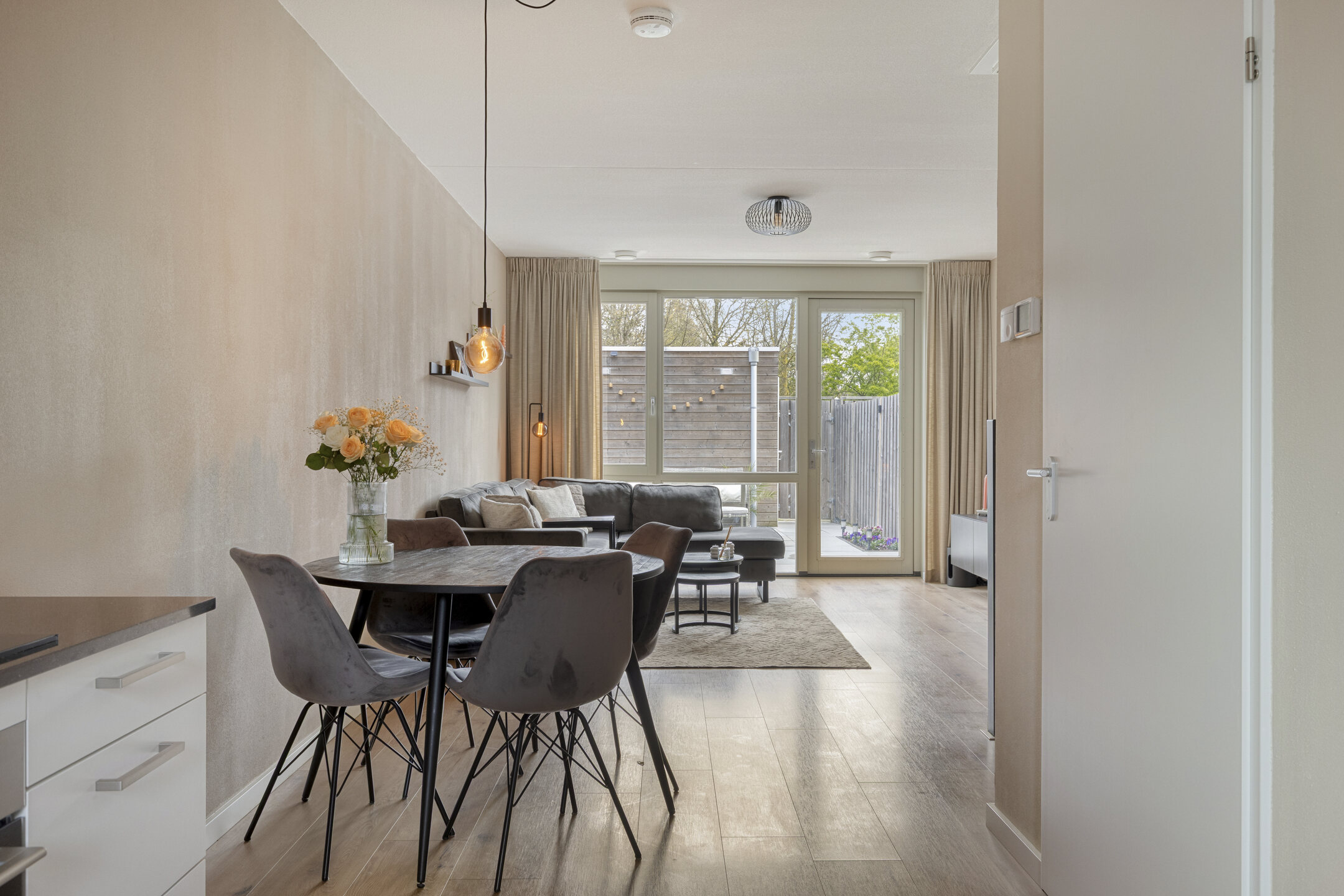 De woning is gebouwd in 2022 en strak afgewerkt. De woonkamer voelt licht en verzorgd aan, is voorzien van een nette laminaatvloer en staat in directe verbinding met de achtertuin. De tuin is keurig aangelegd en biedt een fijne plek om buiten te zitten.