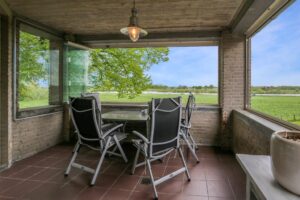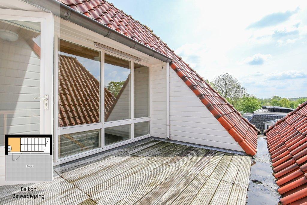 – Vanuit deze grote ruimte is er via een vaste trap toegang tot de tweede buitenruimte, een extra balkon met uitzicht over de omgeving.