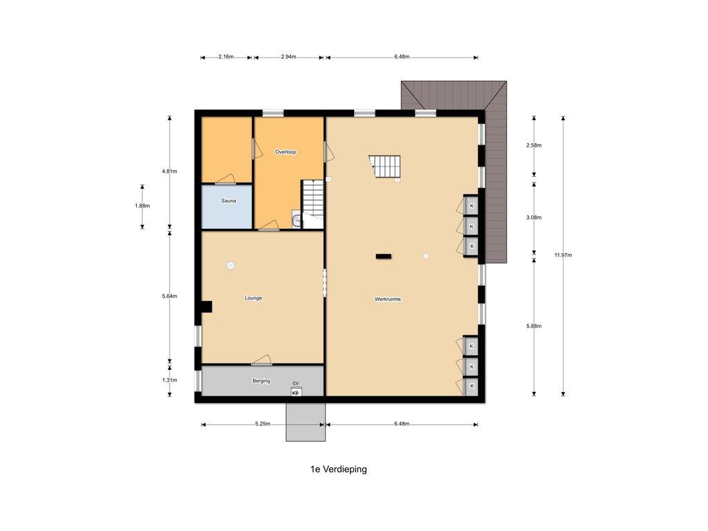 – Grote open ruimte van circa 75 m², multifunctioneel inzetbaar als bijvoorbeeld hobbyruimte, kantoor of extra living, atelier, fitnessruimte, “chillruimte” voor de (klein)kinderen etc.