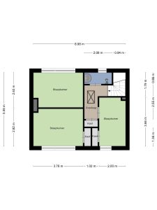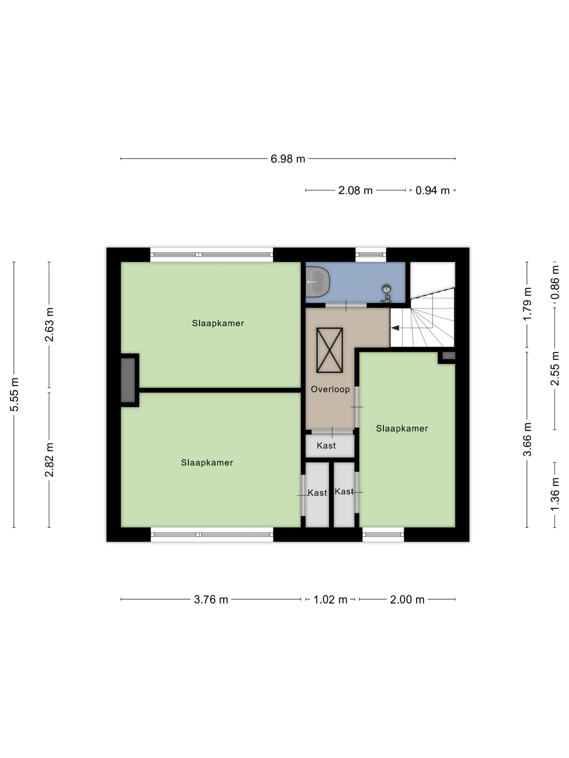 Op de eerste verdieping zijn drie functionele slaapkamers aanwezig, geschikt als slaap-, werk- of hobbykamer. De badkamer is praktisch uitgevoerd met een inloopdouche en wastafelmeubel. Via een vlizotrap is de zolder bereikbaar, ideaal als extra bergruimte.