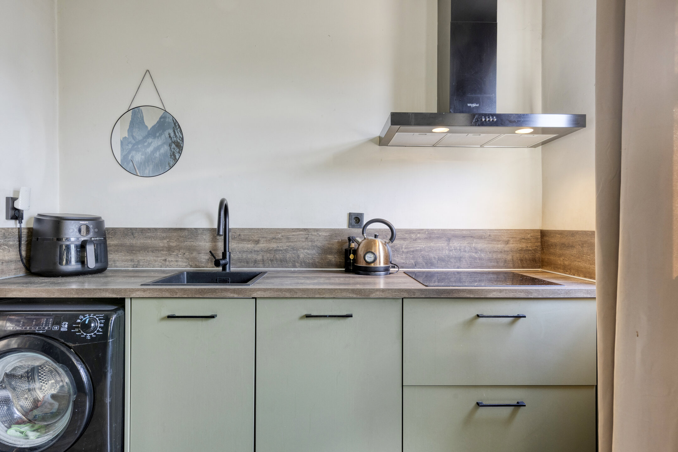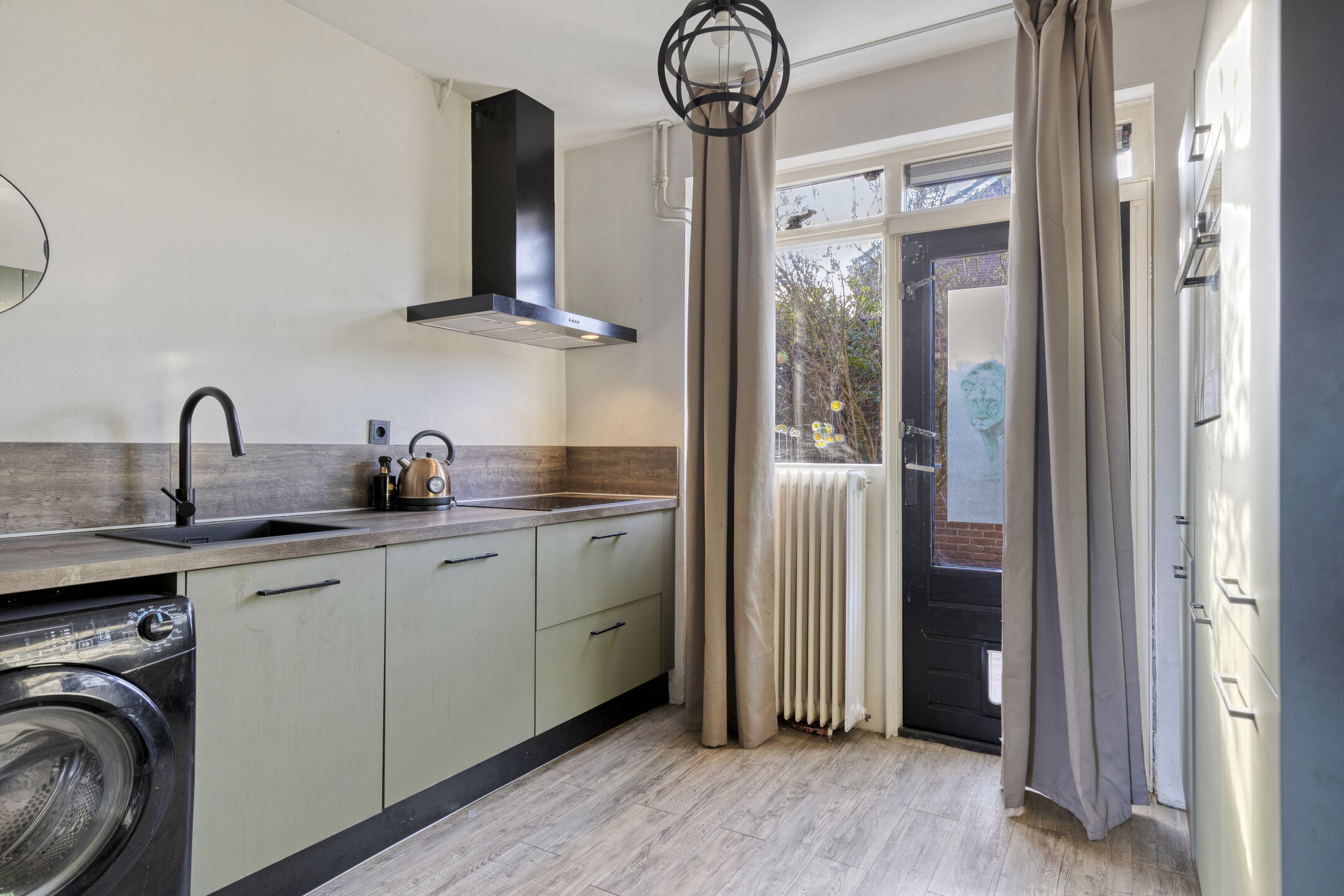 – In 2023 vernieuwde gesloten keuken met frisse lichtgroene uitstraling, voorzien van inductiekookplaat, combi-oven, vaatwasser en koelkast. Tevens een aansluiting voor de wasmachine.