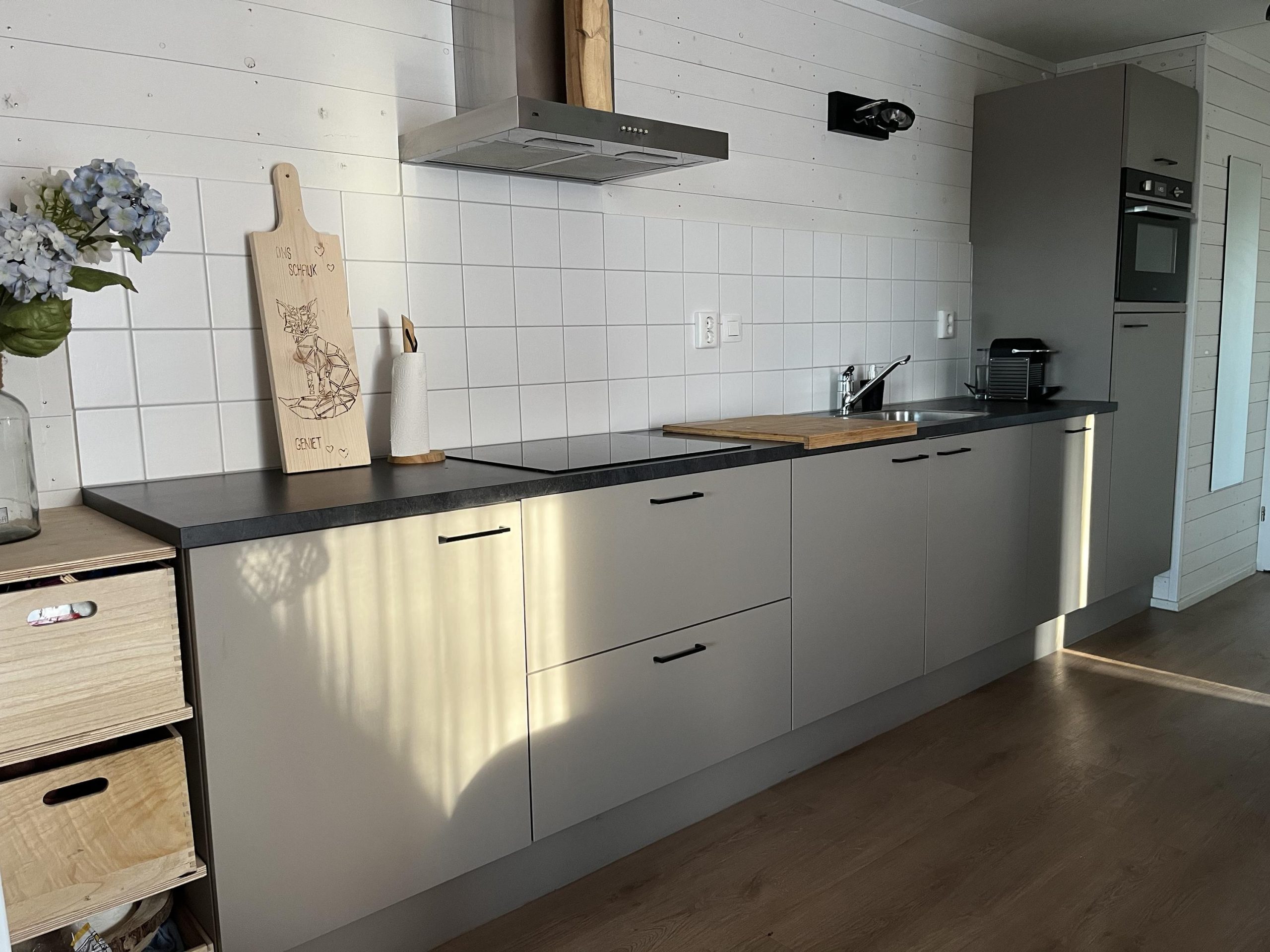 De open keuken biedt volop ruimte iedere hobbykok en compleet uitgerust met onder andere een inductiekookplaat, combi-oven, vaatwasser en koel-vriescombinatie. Dineren doe je gezellig aan de grote eettafel of buiten in de zonnige tuin. De vrijstaande berging, voorzien van stroom, biedt extra opslagruimte voor privé-eigendommen zoals een BBQ of terrasverwarmer.