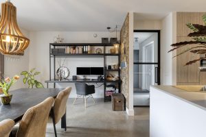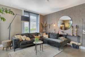 Via fraaie stalen deuren bereik je de sfeervolle woonkamer aan de voorzijde. Door de prettige indeling en fijne lichtinval voelt deze ruimte zowel ruim als comfortabel aan.