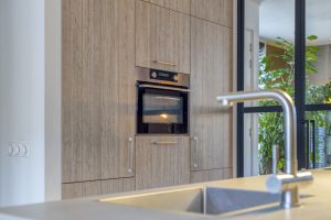 – Luxe keuken voorzien van 4-pits inductiekookplaat met geïntegreerde afzuiging, combi-oven, koelkast, vaatwasser en kokend waterkraan.