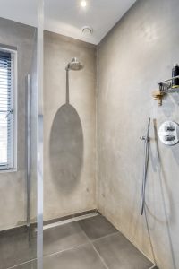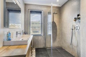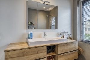 – Moderne badkamer met inloopdouche, ruim wastafelmeubel, zwevend toilet en vloerverwarming.