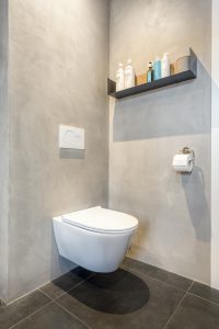 Op de eerste verdieping bevinden zich drie volwaardige slaapkamers, waarvan één momenteel is ingericht als praktische walk-in closet. De moderne badkamer is stijlvol afgewerkt met betonstuc wanden en antracietkleurige tegels. De ruimte beschikt over een ruime inloopdouche, een fraai houtlook wastafelmeubel en een zwevend toilet.