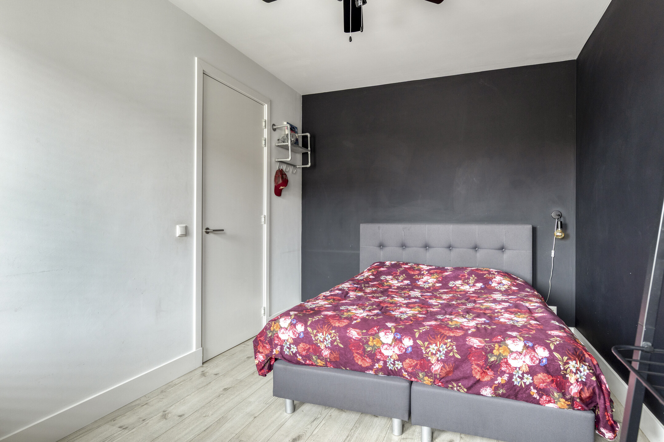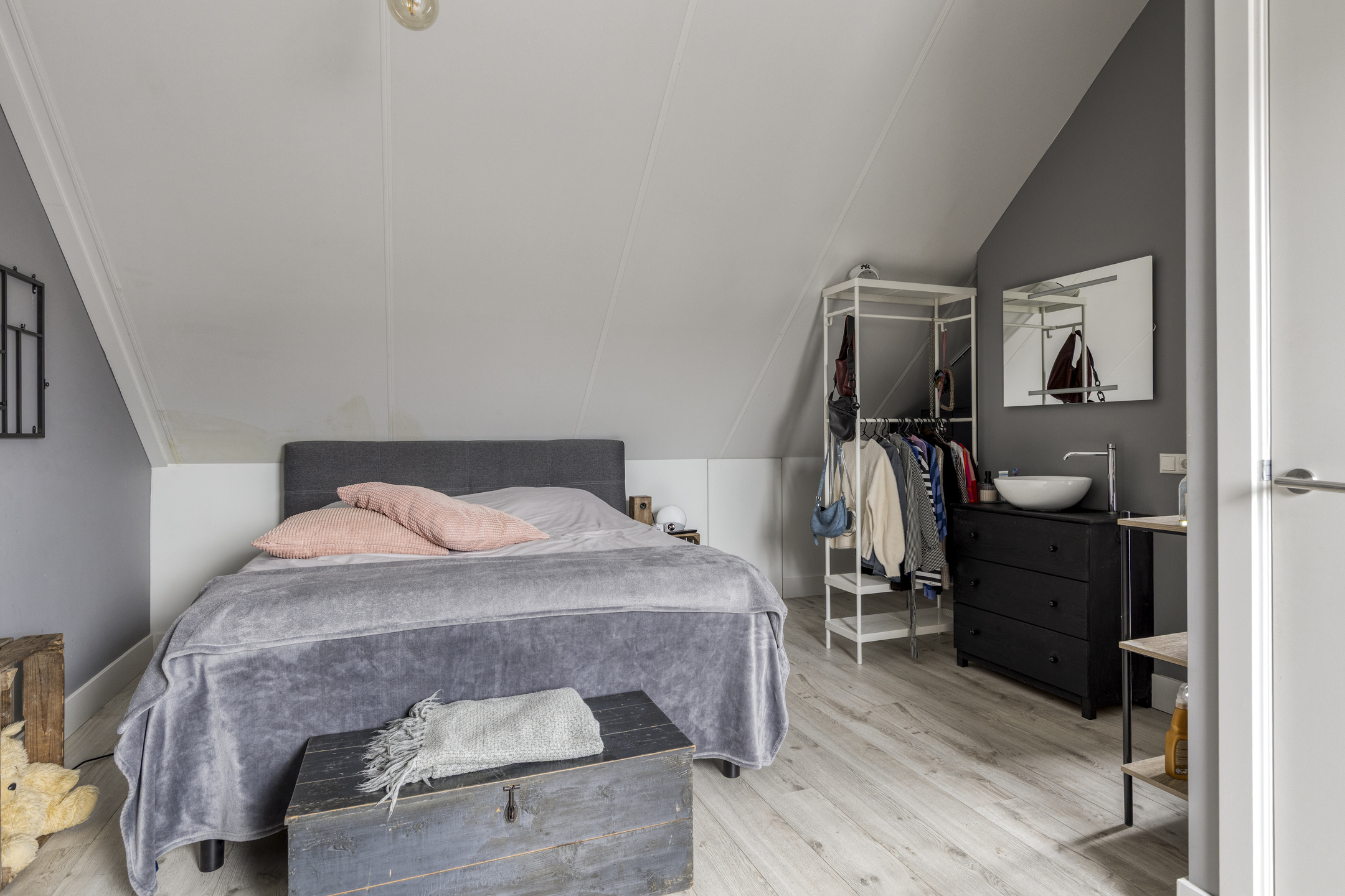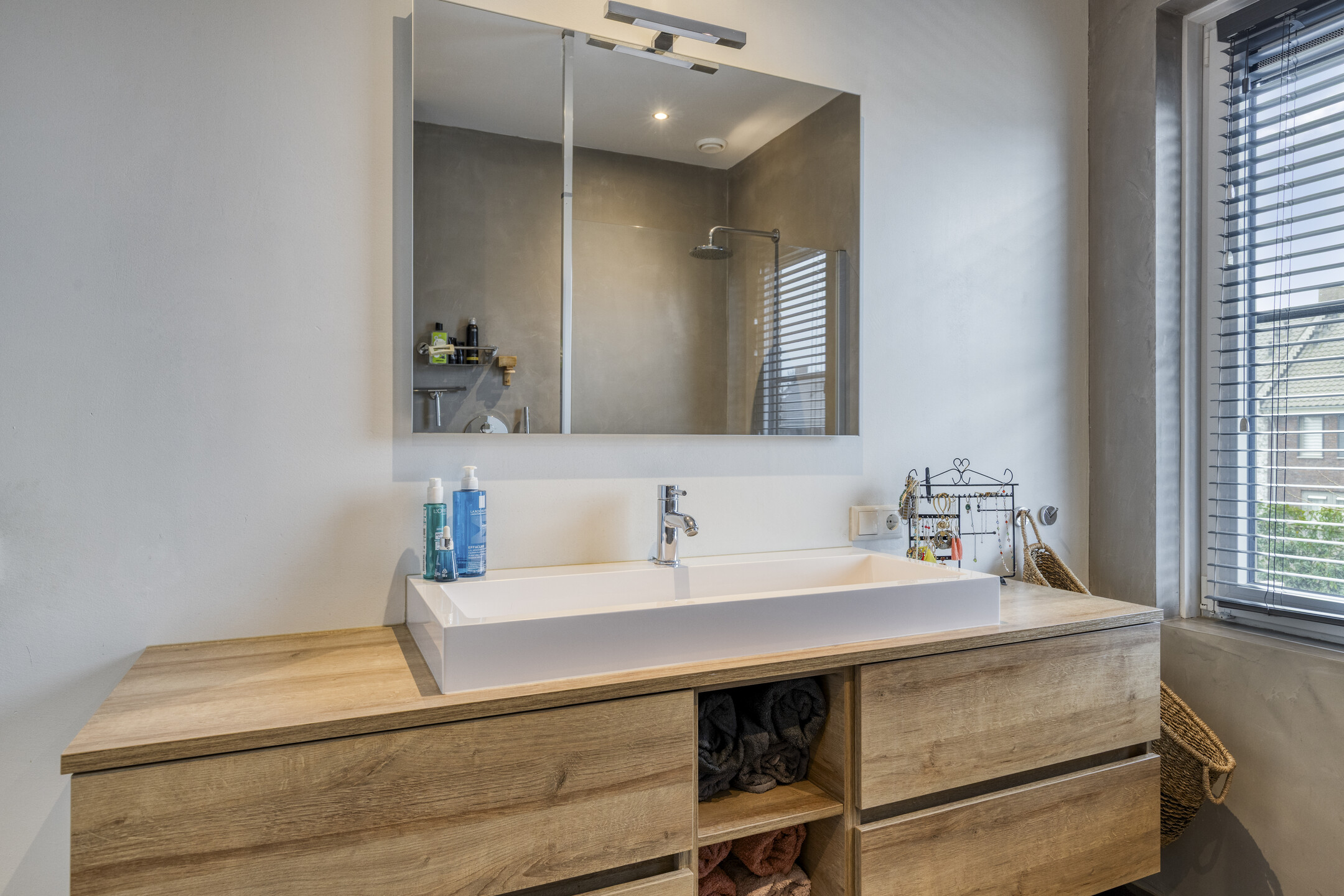 Op de eerste verdieping bevinden zich drie volwaardige slaapkamers, waarvan één momenteel is ingericht als praktische walk-in closet. De moderne badkamer is stijlvol afgewerkt met betonstuc wanden en antracietkleurige tegels. De ruimte beschikt over een ruime inloopdouche, een fraai houtlook wastafelmeubel en een zwevend toilet.