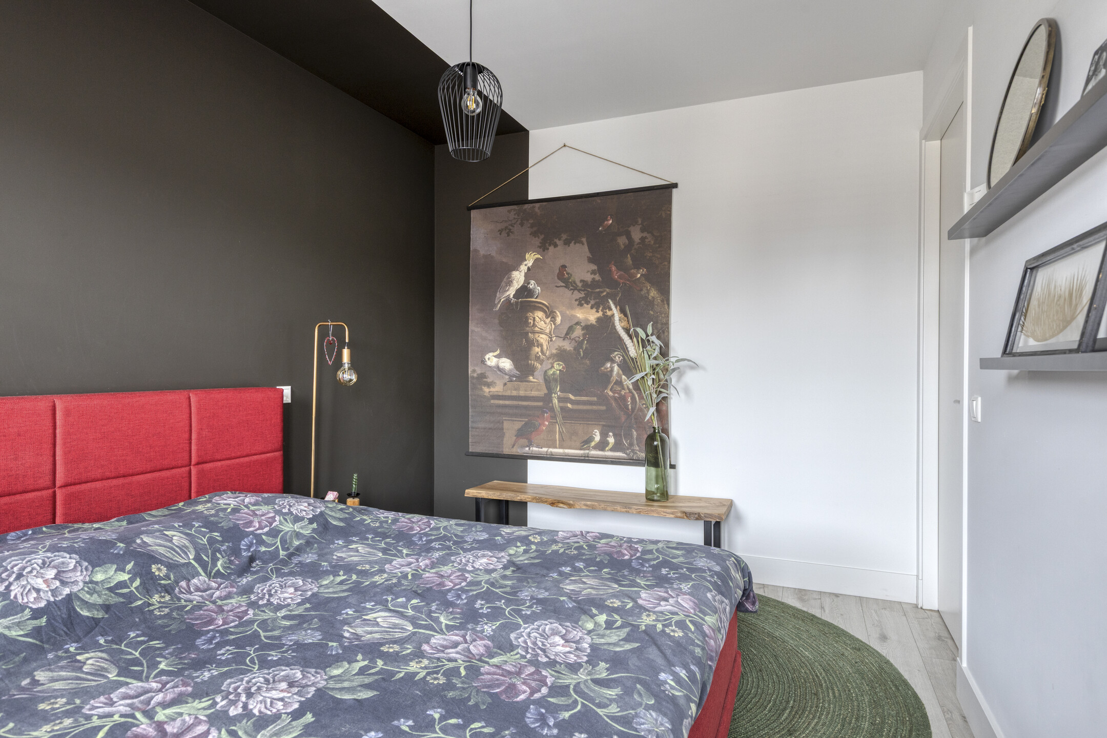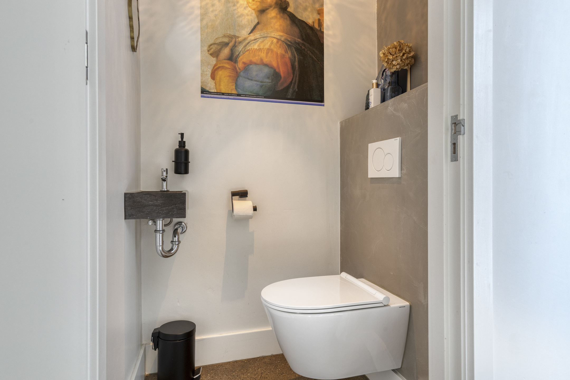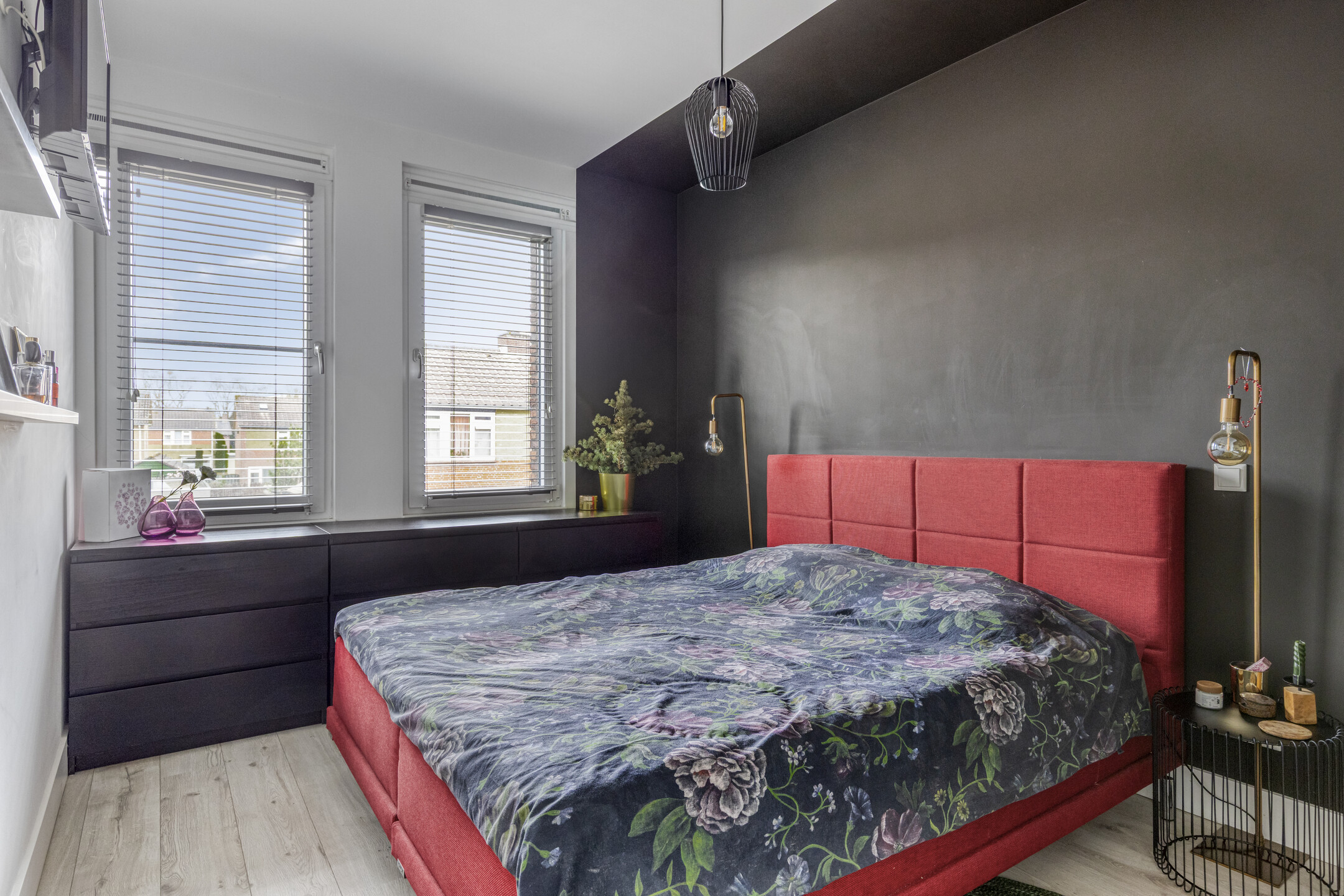Op de eerste verdieping bevinden zich drie volwaardige slaapkamers, waarvan één momenteel is ingericht als praktische walk-in closet. De moderne badkamer is stijlvol afgewerkt met betonstuc wanden en antracietkleurige tegels. De ruimte beschikt over een ruime inloopdouche, een fraai houtlook wastafelmeubel en een zwevend toilet.