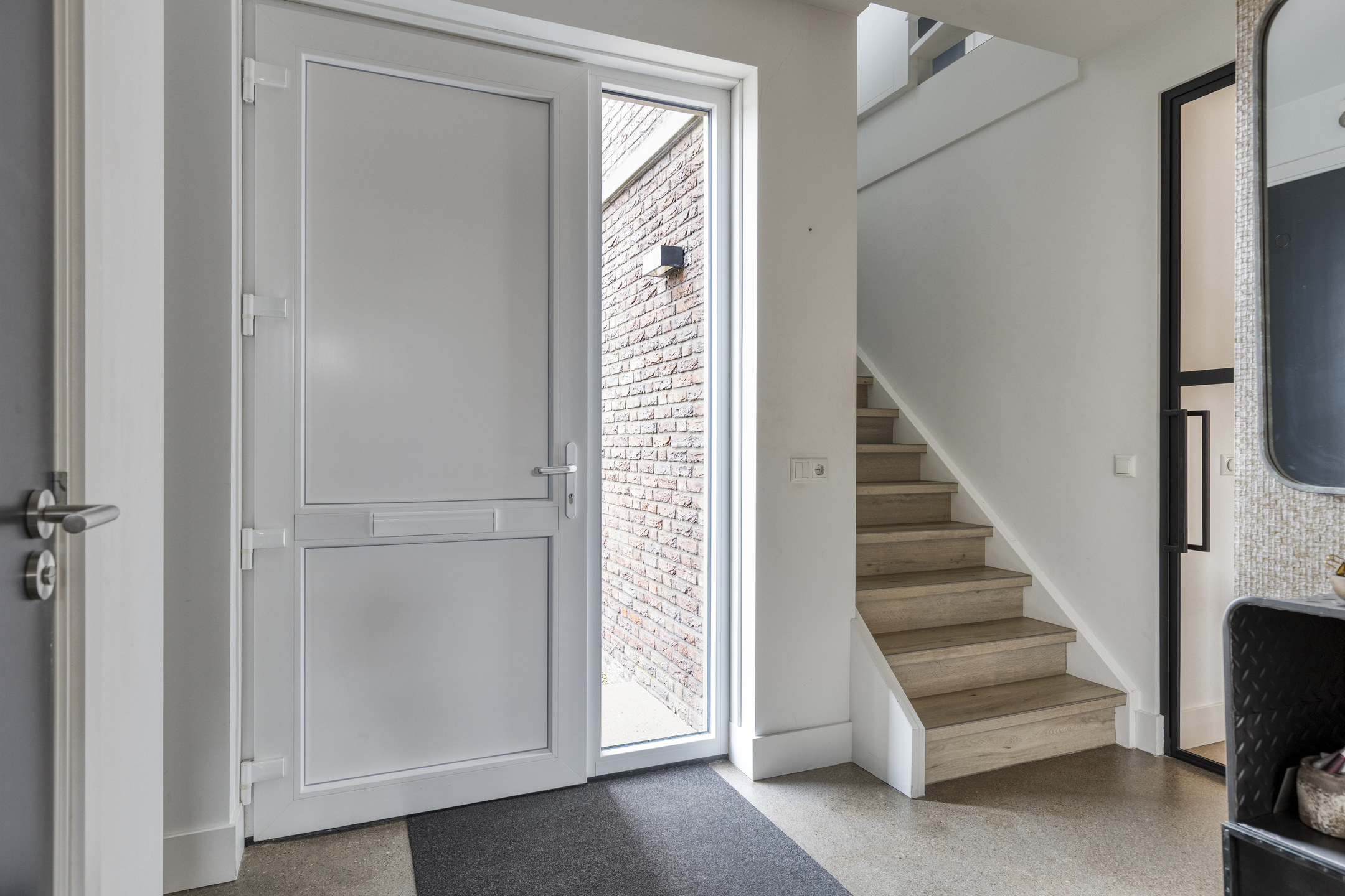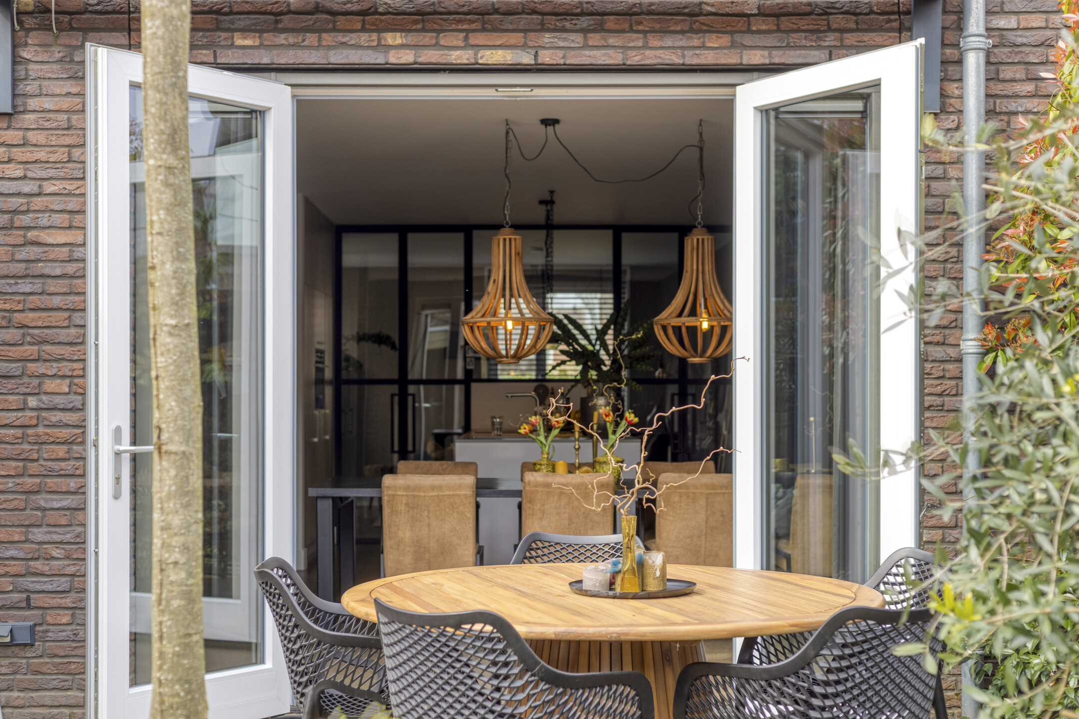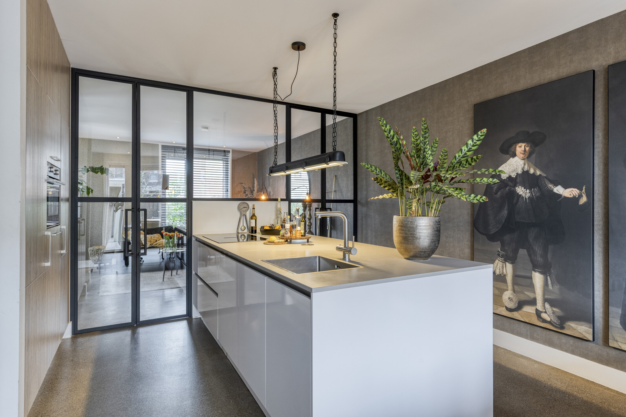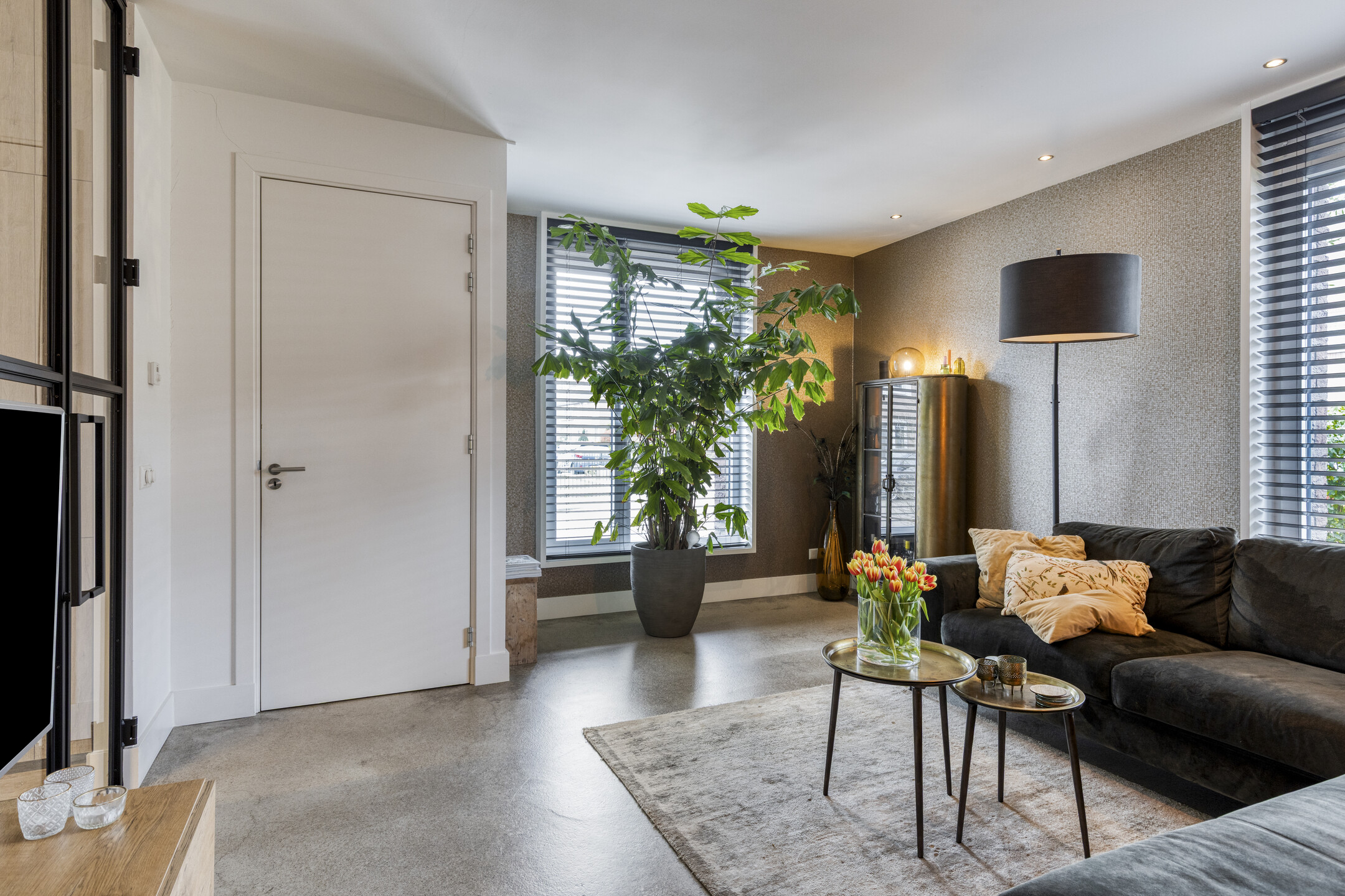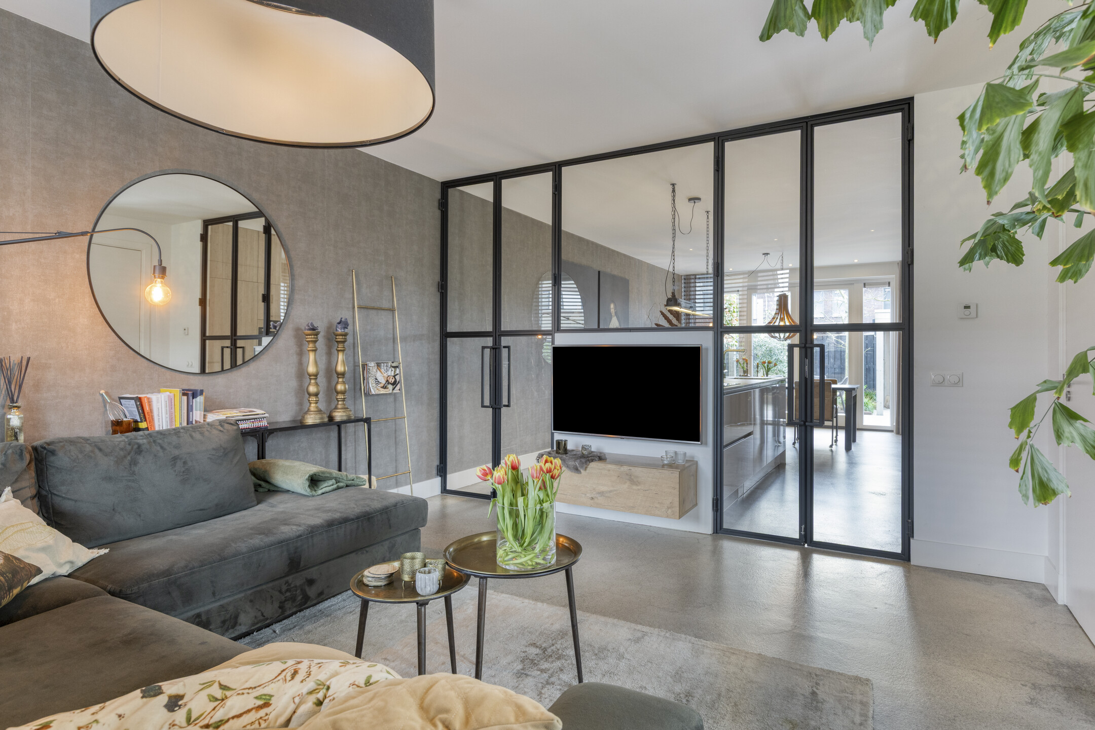 Via fraaie stalen deuren bereik je de sfeervolle woonkamer aan de voorzijde. Door de prettige indeling en fijne lichtinval voelt deze ruimte zowel ruim als comfortabel aan.
