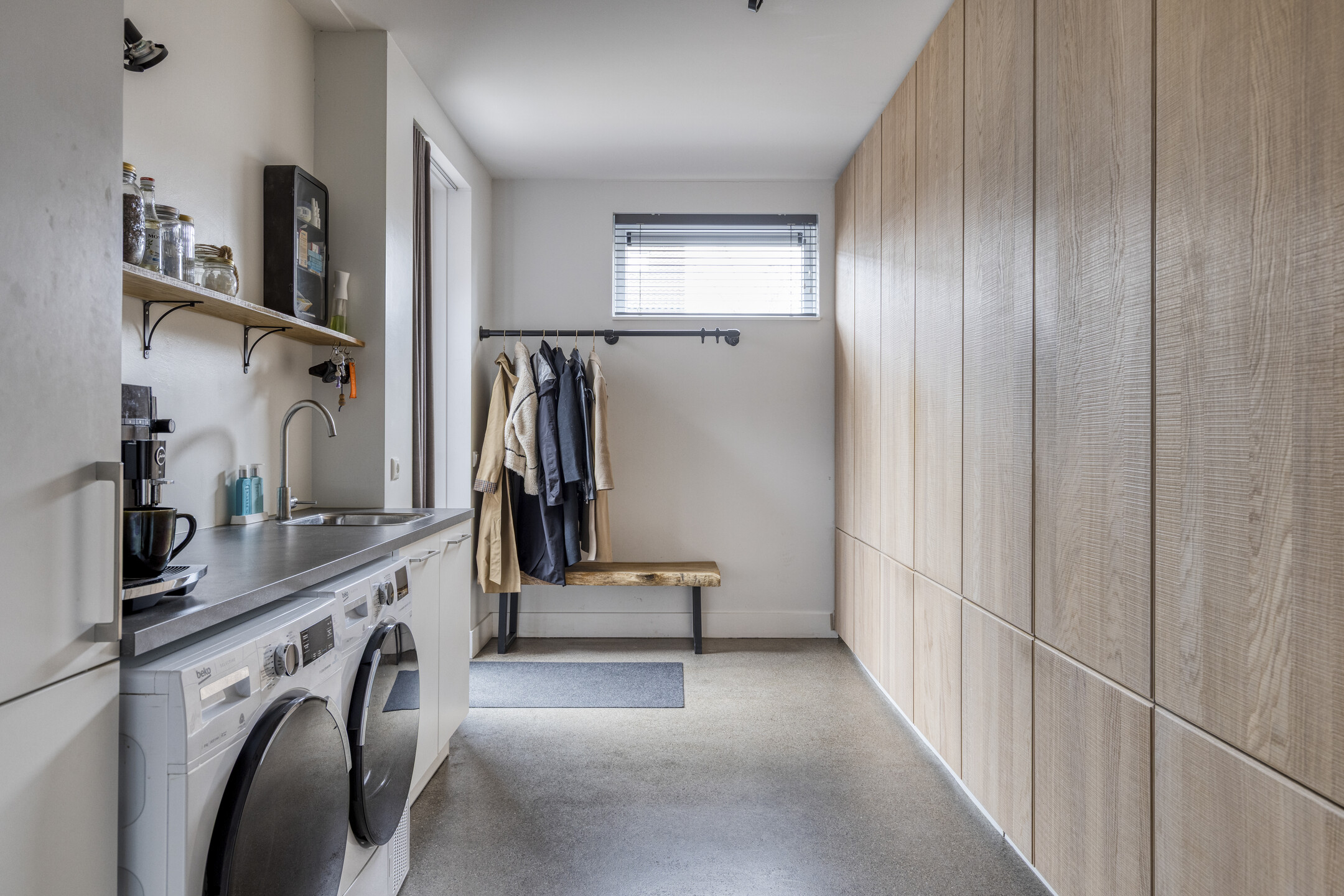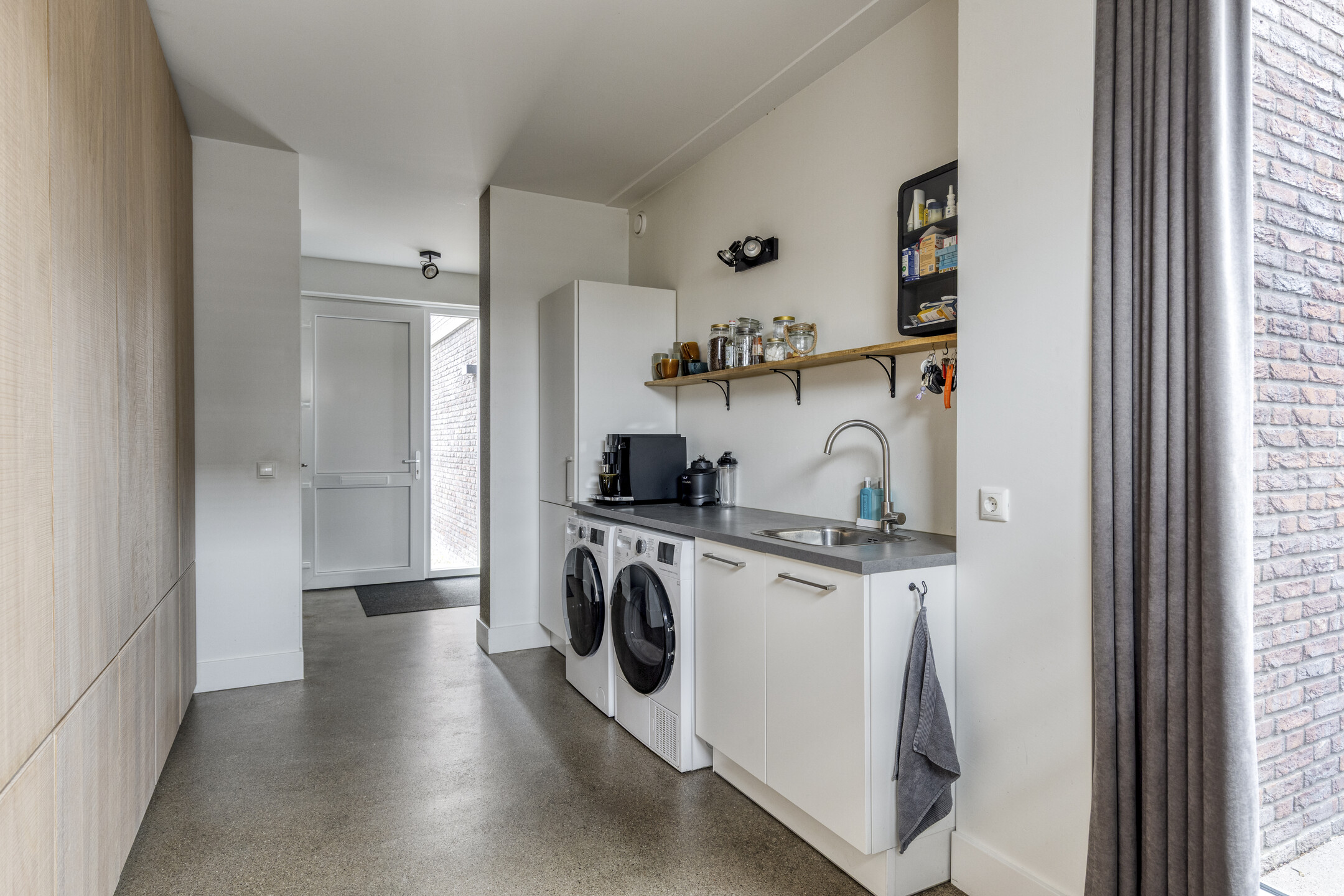 Via de oprit met parkeergelegenheid op eigen terrein bereik je de verzorgde entree van de woning. In de hal bevinden zich de moderne toiletruimte, de trapopgang naar de verdieping en de praktische bijkeuken/berging. Deze ruimte is voorzien van een keukenblok met diepvries, witgoedaansluitingen en maatwerkkasten, ideaal voor extra bergruimte en dagelijks gemak.