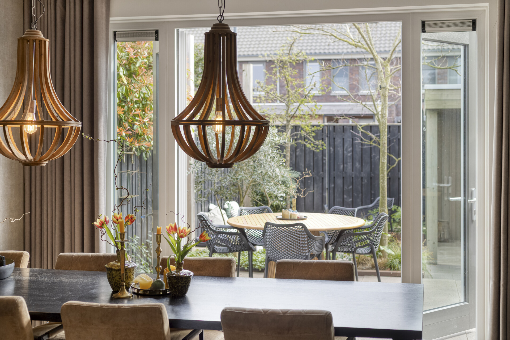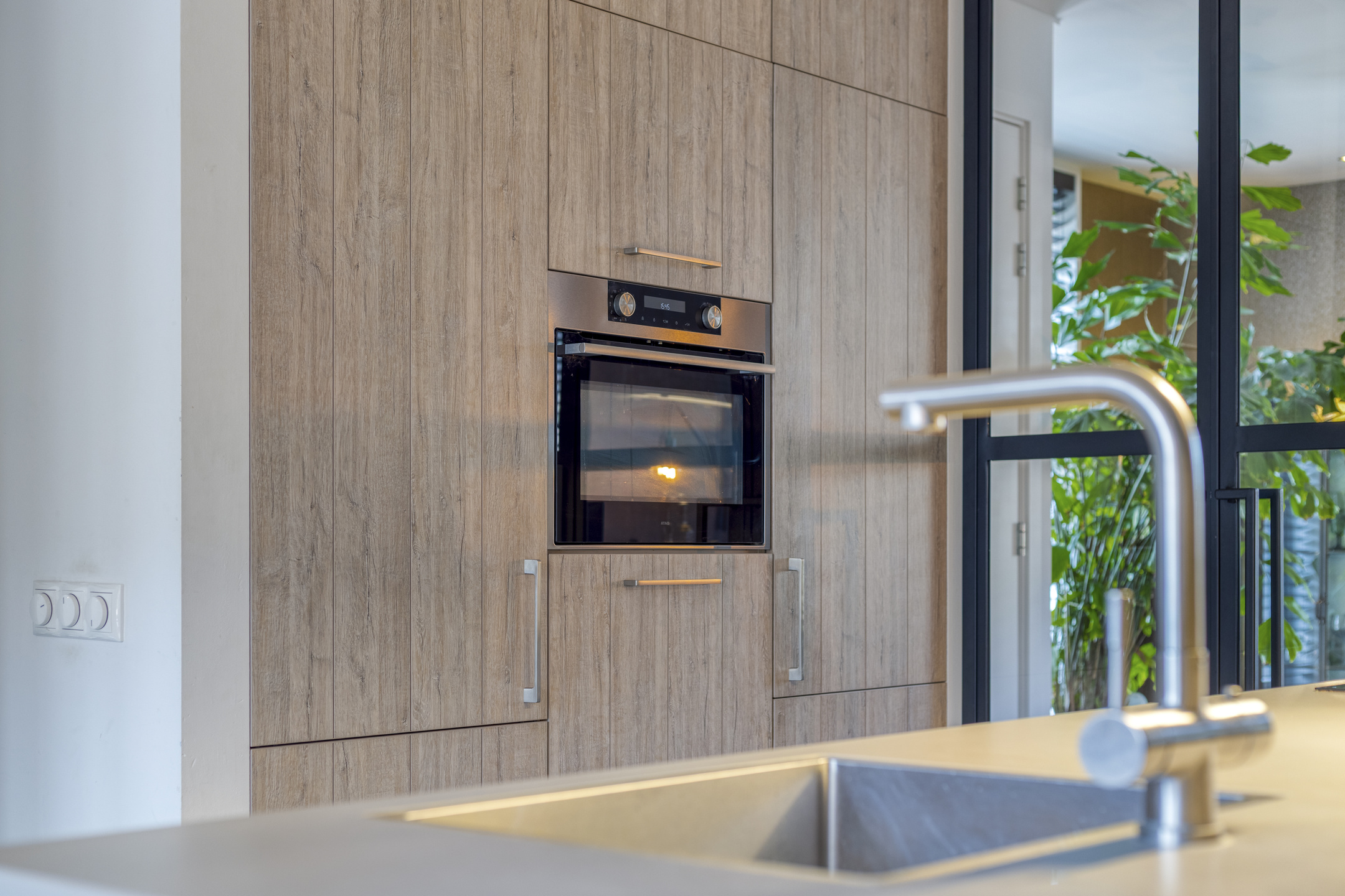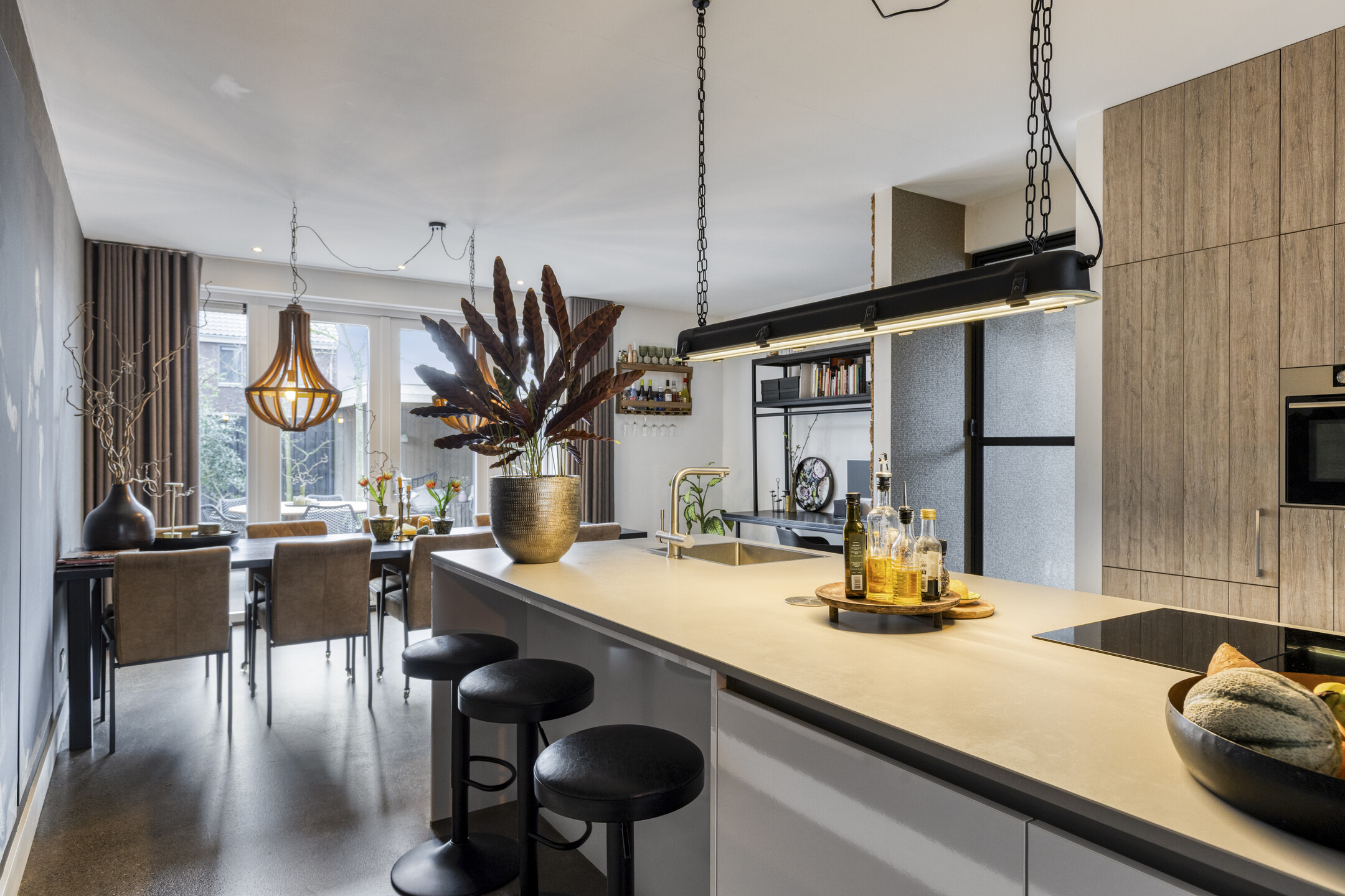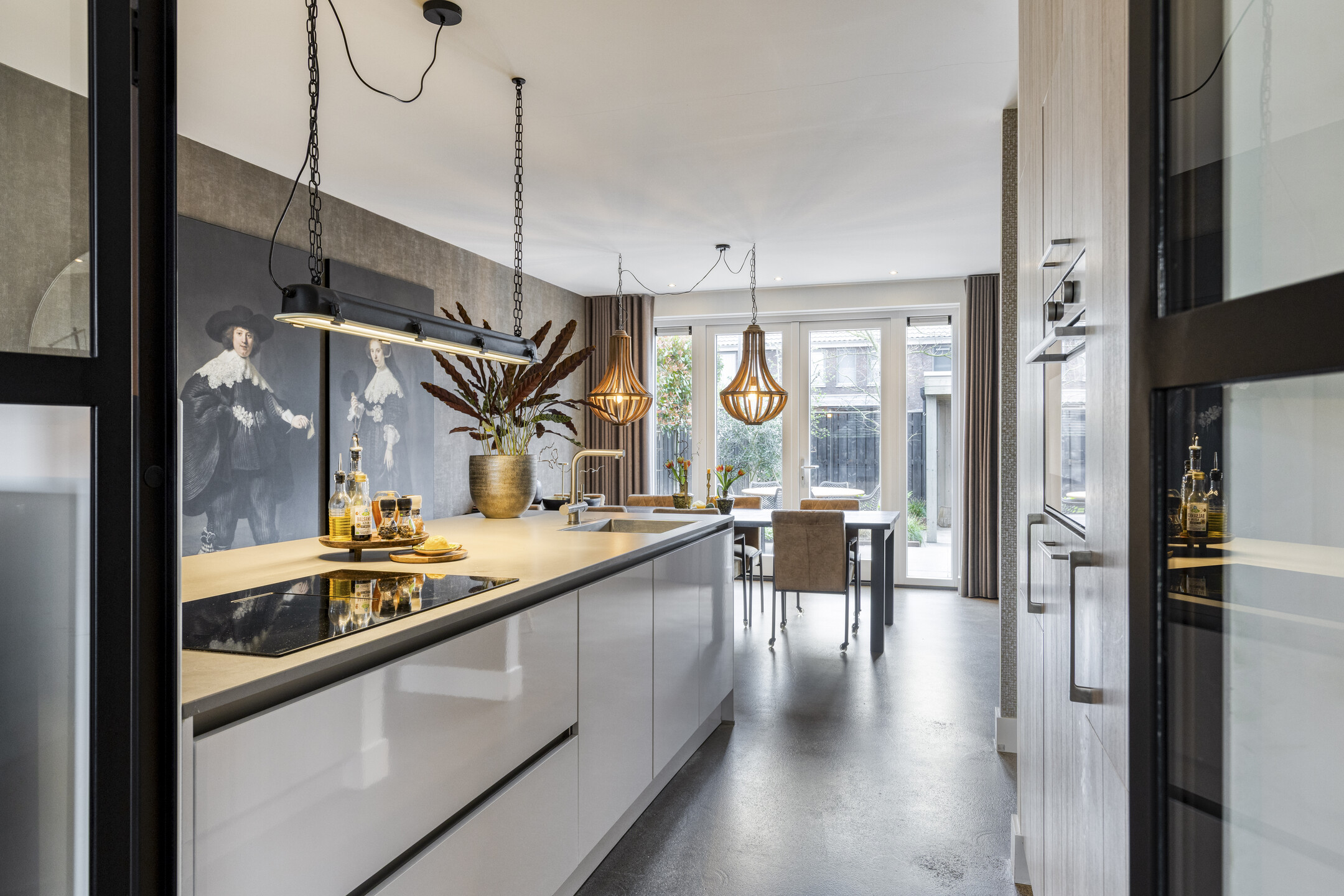 De royale leefkeuken aan de achterzijde vormt het hart van de woning en is een heerlijke plek om te koken, tafelen en samen te komen. Er is volop ruimte voor een grote eettafel en eventueel een werk- of studieplek. Dankzij de openslaande deuren loopt deze ruimte mooi over in de tuin. De luxe keuken is compleet uitgevoerd met een inductiekookplaat met geïntegreerde afzuiging, vaatwasser, koelkast, combi-oven en een kokendwaterkraan.