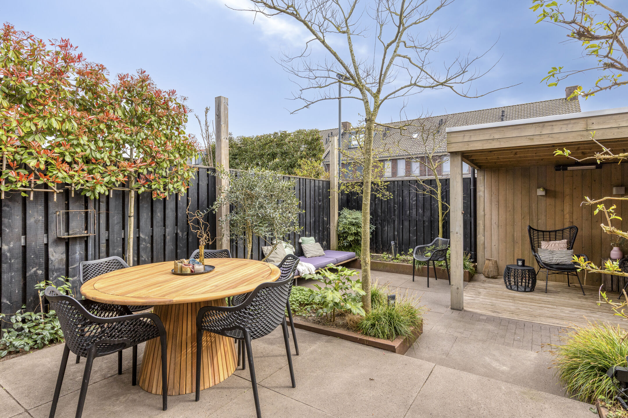 De fraai aangelegde achtertuin is met veel zorg en oog voor detail ingericht en heeft een gunstige ligging op het zuiden. Hierdoor geniet je hier gedurende de hele dag van de zon. De tuin is bereikbaar via een praktische achterom en voorzien van een elektrische zonneluifel. De houten berging met veranda vormt een mooie aanvulling en biedt een heerlijke plek om buiten te zitten of extra spullen op te bergen. Aan de achterzijde van het perceel is bovendien extra parkeergelegenheid aanwezig.